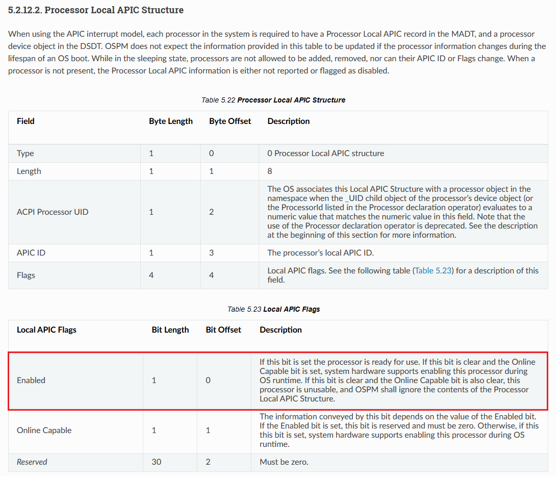 操作系统中可用的CPU信息,来源自内核在启动过程中解析的MADT(Multiple APIC Description Table)。每个被系统识别的处理器都必须在MADT中对应一个本地APIC条目,其中“Enabled”属性是关键指标,用以表明硬件是否允许该处理器在操作系统中被启用。