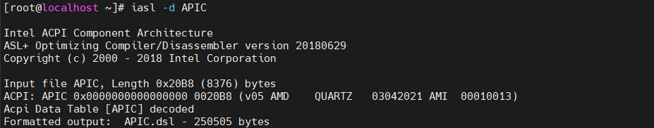 系统下的ACPI表存储于 /sys/firmware/acpi/tables 目录下,可以通过acpica-tools套件工具提供的iasl命令进行反编译查看: