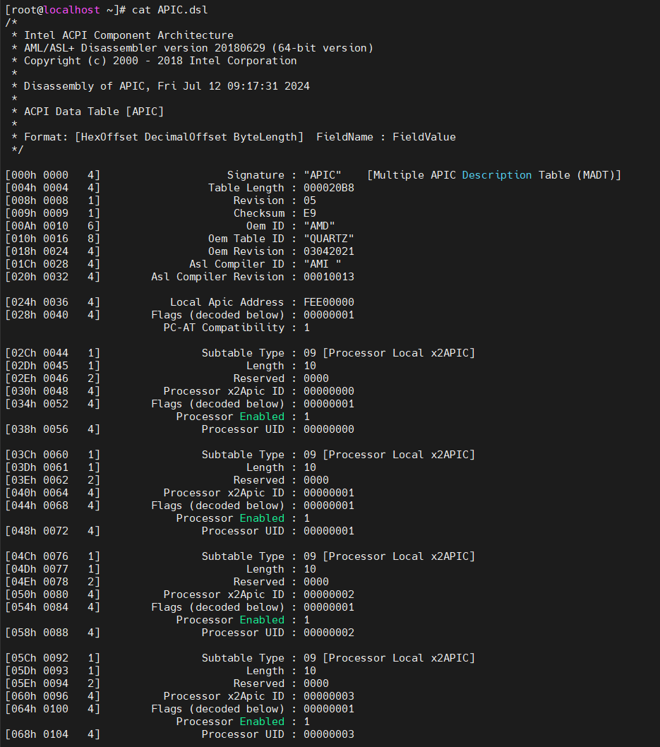 系统下识别的CPU核心数,来源于BIOS提供给操作系统的多处理器描述表MADT(Multiple APIC Description Table),在本次系统问题诊断中,我们发现操作系统识别到的CPU核心数量异常,不符合硬件规格,经过深入分析,确定问题根源在于BIOS提供的高级配置和电源接口(ACPI)中的多处理器描述表(MADT)。在操作系统下,通过使用acpica-tools工具集内的iasl命令对MADT数据进行反编译,检查了表中CPU核心启用状态的配置信息,发现其中只有128个处理器核心被标记为启用状态。