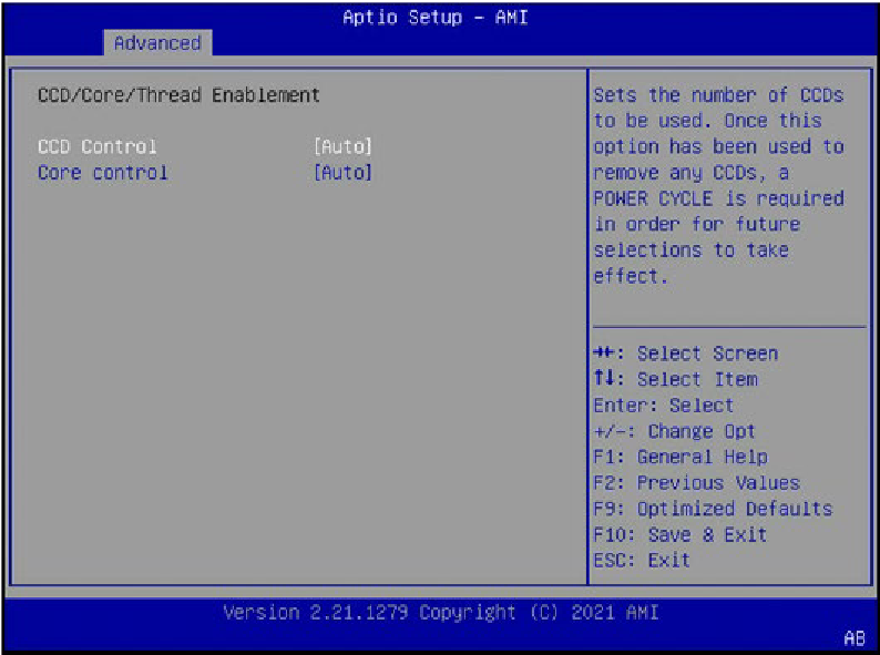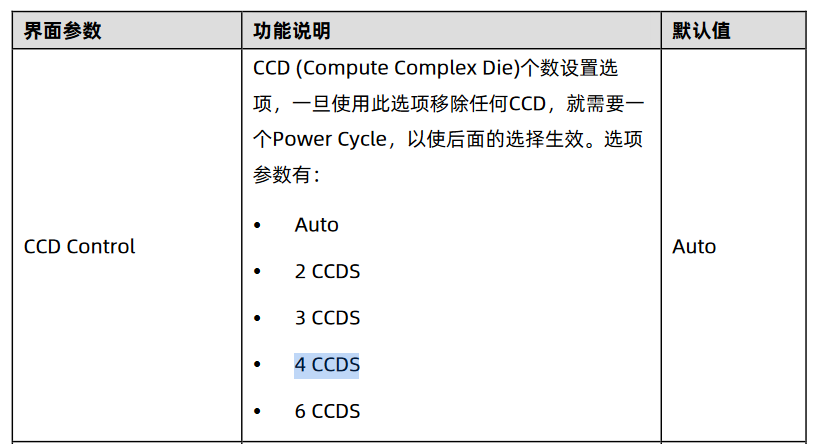 (6)在对BIOS配置进行检查时,注意到针对CPU核心数量限制的特定设置项"CCD Control",可以用于调整实际使用的CCD数量,经对照BIOS用户手册,发现该选项的默认值是“Auto”,但当前被设定为"4 CCDS"。