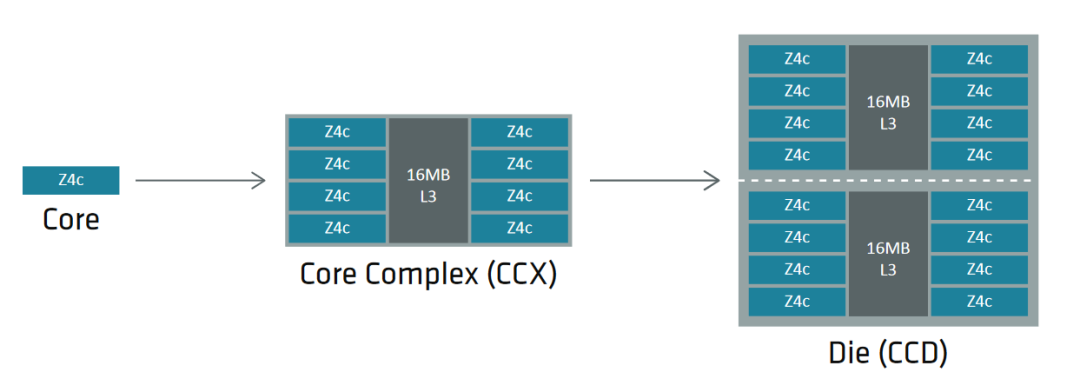 由于单个AMD EPYC 9654 CPU设计上有96个核心,这些核心按照12个CCX(每个CCX包含8个核心)以及6个CCD(每个CCD由2个CCX组成,即16个核心)的架构组成。
