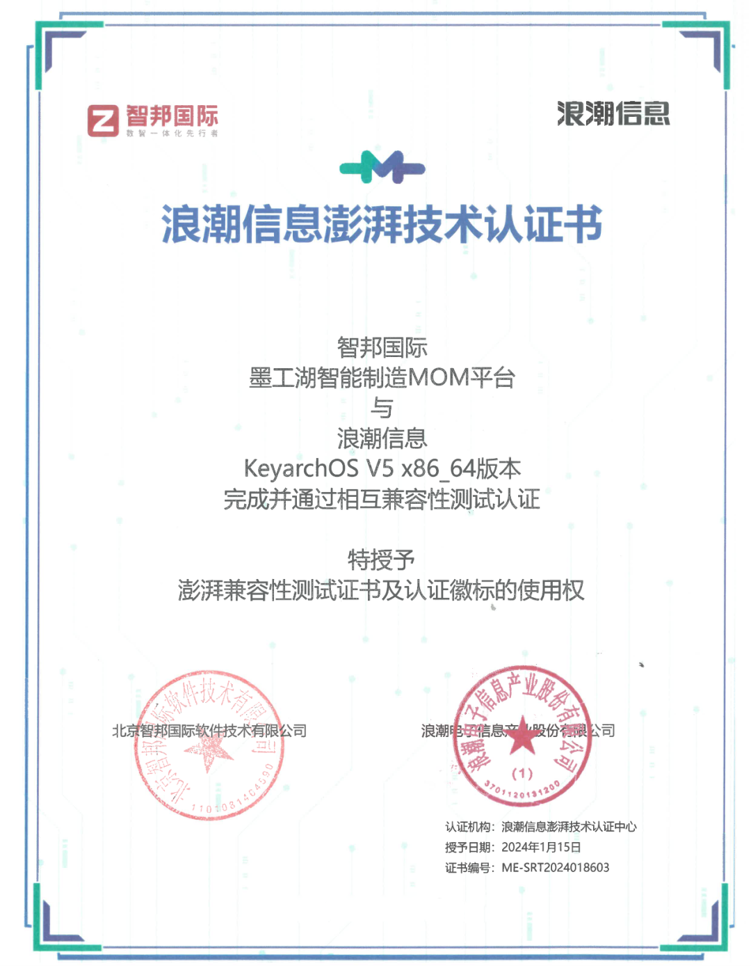 日前,北京智邦国际软件技术有限公司(简称智邦国际)与KeyarchOS完成浪潮信息澎湃技术认证,经双方测试,智邦国际墨工湖智能制造MOM平台与浪潮信息KeyarchOS V5完全兼容,整体运行稳定高效,满足用户的关键性应用需求,获得相应兼容性认证证书。
