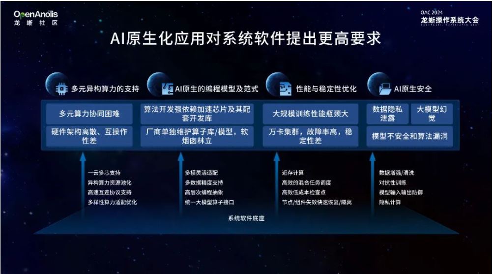 通过堆砌资源的方式满足AI需要的道路很难持续,这个过程中操作系统面临几个挑战:一是对多元算力的支持,操作系统需要协调CPU、GPU以及其他专用芯片,如何把算力高效组织起来;二是AI本身的编程环境非常复杂,软烟囱林立,用户面临环境选择难题;三是效率、性能的优化和可靠性、稳定性等方面,对操作系统提出更高要求,在出现故障的时候能够快速定位,能够快速恢复;最后,确保AI原生的安全,防止数据隐私泄露。