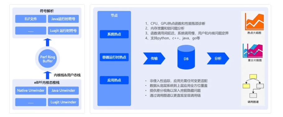 Continues Profiling 持续剖析是近几年云原生可观测性很重要的技术,通过 eBPF 技术能做到持续的非侵入方式进行数据的采集,支持对 Java、python、Luajit 等高级语言进行符号解析,也支持对 C、C++、Golang、Rust 等 Native 语言的应用进行推栈,由于它可以动态进行安装和卸载程序,持续对当前运行的 CPU 热点进行采样分析,不需要重启进程或事先编译埋点,相比传统的 APM 插桩方式带来显著的易用性、安全性,因此它极有可能成为继可观测性的 Trace、Log、Metric 之后的第四大支柱。持续剖析功能基于eBPF 可以分析用户态和内核态的栈,对不同语言的应用统一采用一套架构进行采样和分析,通过火焰图、调用图表的方式进行热点的展现。