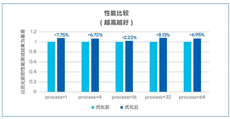 浪潮信息云峦服务器操作系统KeyarchOS对英特尔® 至强® 6 处理器进行了全面的适配优化,并通过Unixbench综合跑分以验证优化效果。Unixbench综合测试跑分提升29%8,表明浪潮信息云峦服务器操作系统KeyarchOS能够充分发挥英特尔® 至强® 6 处理器的性能,为用户提供一个高效、稳定、安全的计算平台。
