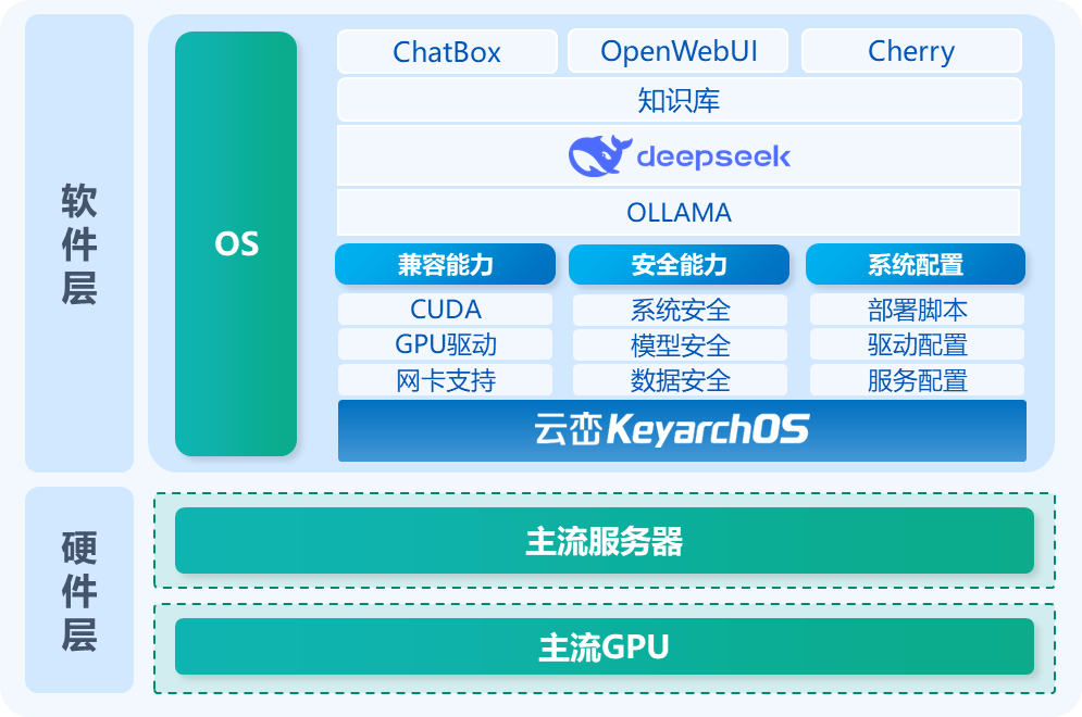 服务器及GPU广泛支持:方案选用云峦KeyarchOS作为底层操作系统,天然兼容主流AI服务器,并全面支持国内外主流消费级与服务器级GPU,能够支撑DeepSeek在不同计算环境下顺利运行。灵活的硬件兼容性,减少了笔者在部署DeepSeek时的适配成本。