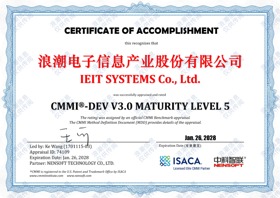 此次斩获CMMI 3.0五级认证,标志着浪潮信息在软件技术研发、项目过程管理能力等方面接轨国际最新标准,达到国际领先水平,可以为用户提供更成熟的产品以及更优质高效的服务。