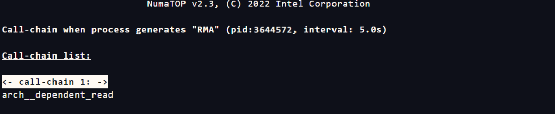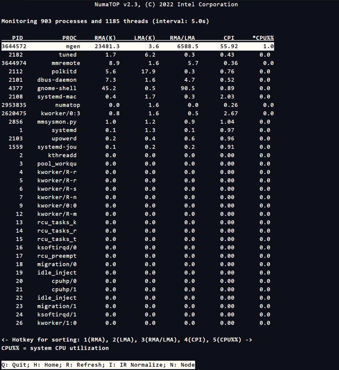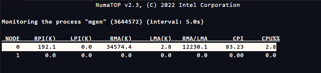 从上图中可以得出结论:id号为3644572的进程mgen产生了大量的RMA,延迟为55.92,故mgen即是当前Numa内存访问中局部性最差的进程。