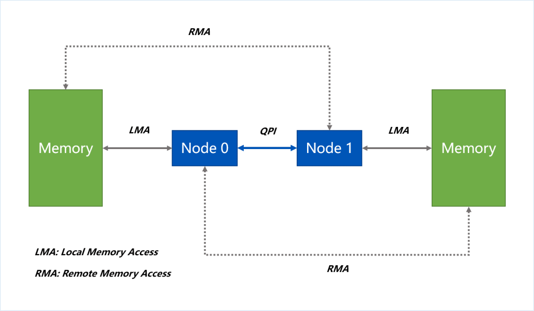 所谓 RMA,即 NUMA 架构下的远程内存访问,是指当前处理器访问远端 NUMA 区域的行为。LMA 与 RMA 的原理如下图所示。