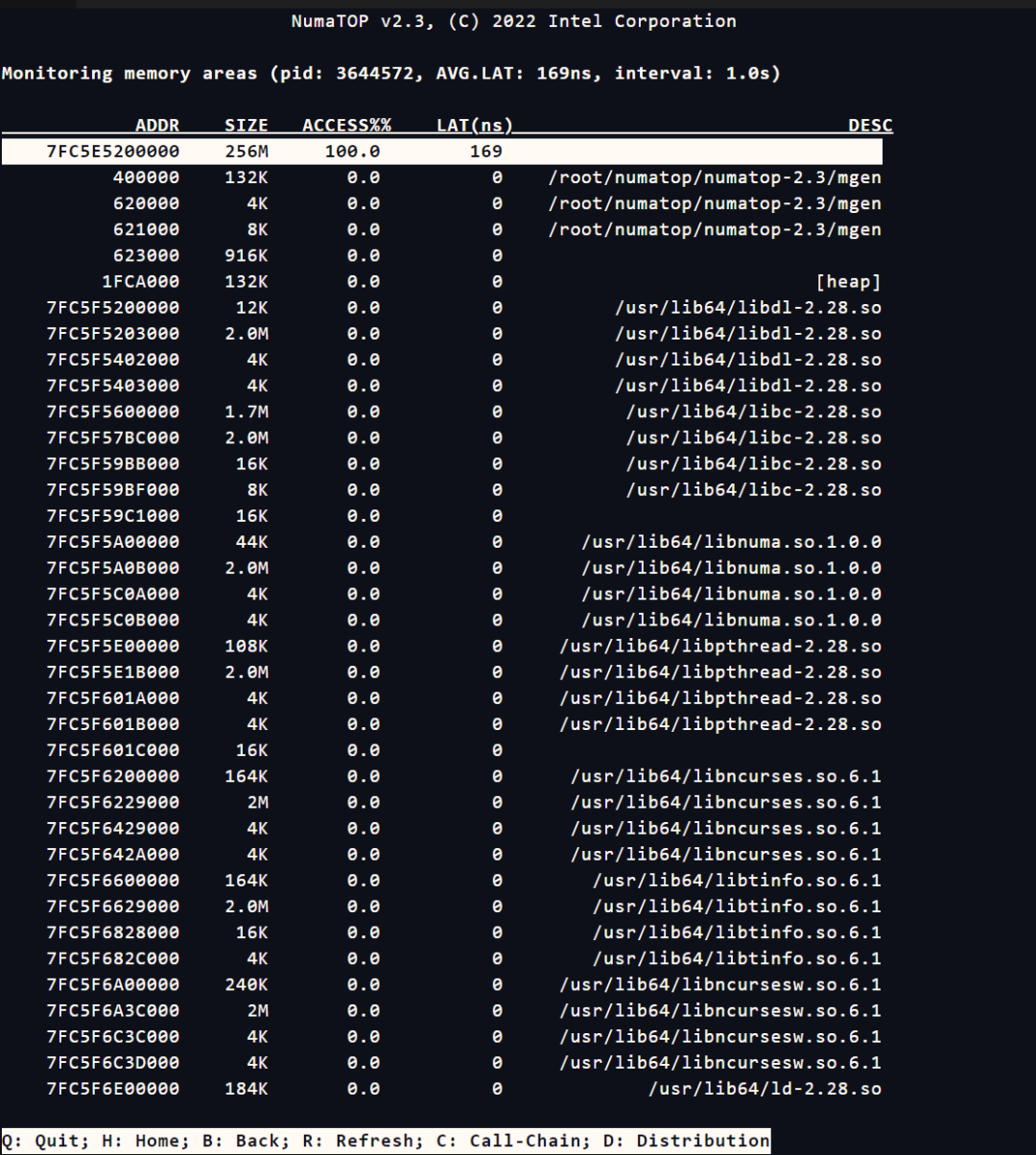 上图描述了进程mgen(pid: 3644572)的虚拟地址空间,其内容与/proc/3644572/maps文件相对应。其中,每一行代表进程的一个vma,ADDR代表虚拟内存地址,SIZE为vma大小,ACCESS%%为vma在当前进程中访问的百分比,LAT代表延迟(ns),DESC代表vma的描述(文件映射或匿名映射)。