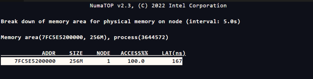 上图表示,256M大小的起始地址为7FC5E5200000的vma在节点1上,且在当前进程vma中访问占比100%,延迟为167ns。