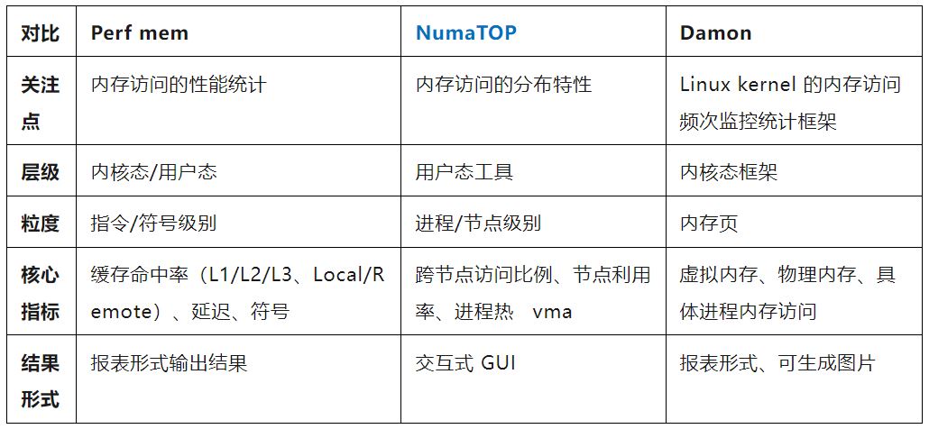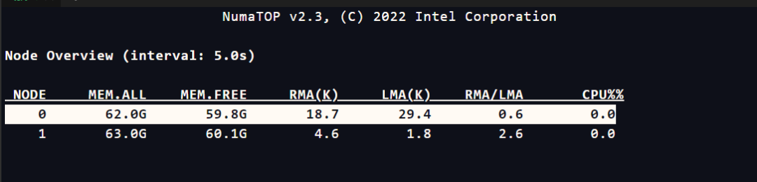 NumaTOP是一个观察工具,用于对NUMA系统上进程/线程运行时内存访问的跟踪和分析,来描述当前进程与线程的NUMA行为,并确定与NUMA相关的性能瓶颈所在的位置。