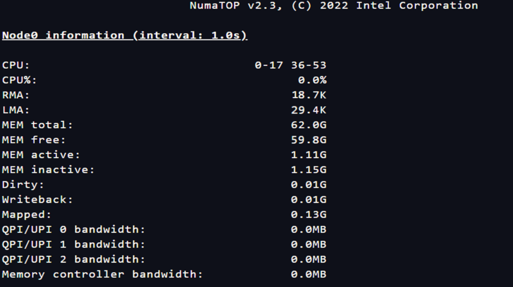 mgen程序启动后,在当前环境中执行NumaTOP,进入NumaTOP交互页面。具体显示如下图: