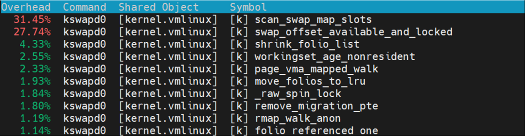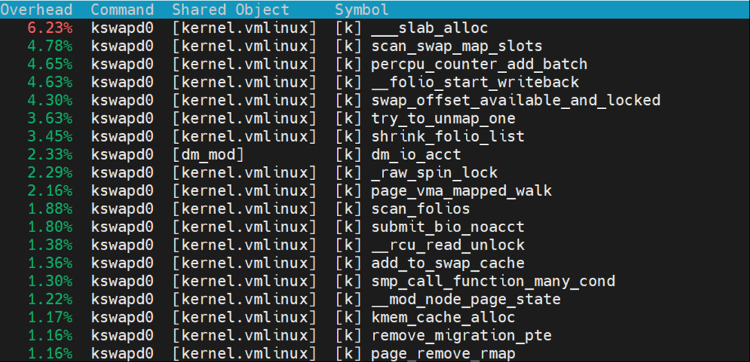 开启MGLRU特性前,监测到scan_swap_map_slots和swap_offset_available_and_locked两个函数占据更多的CPU时间,分别为31.45%和27.74%;开启MGLRU特性后,scan_swap_map_slots和__slab_alloc两个函数占据的CPU时间分别为4.78%和6.23%。__slab_alloc函数的作用是在Slab分配器中分配一个对象,它涉及到内核对象的内存分配。开启MGLRU特性前后,统计前10个内核函数平均CPU使用时间分别为7.63%和3.85%,提升49.54%。说明开启MGLRU具有更高的内存回收效率。