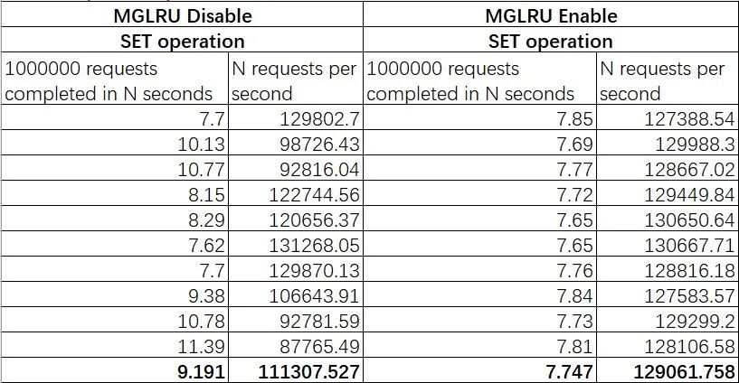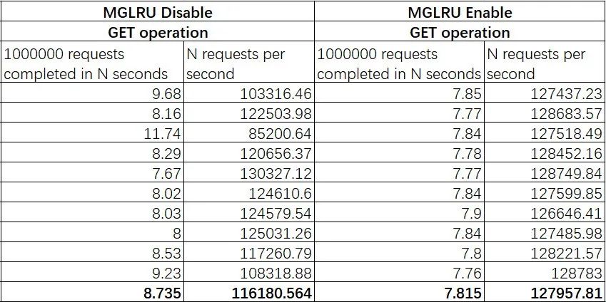 对于GET操作,结果显示开启MGLRU特性前,执行100万个GET操作的请求平均完成时间为8.74秒,即每秒可完成116180个GET操作的请求;开启MGLRU特性后,执行100万个GET操作的请求平均完成时间为7.82秒,即每秒可完成127957个GET操作的请求,性能提升为10.5%。
