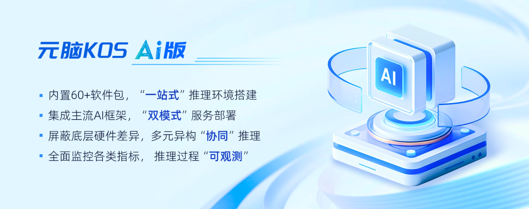 为降低推理服务部署门槛,提高混合算力环境下部署效率,浪潮信息推出元脑服务器操作系统KOS AI版,通过集成60余个专用软件包、CUDA运行库等核心组件及依赖项,实现推理环境一站式部署,环境准备时间从“数天级”压缩至“分钟级”;通过屏蔽底层设备差异实现算力资源智能调度,显著提升混合算力场景下的推理性能,并依托全面监控工具保障模型推理的高效、稳定运行。