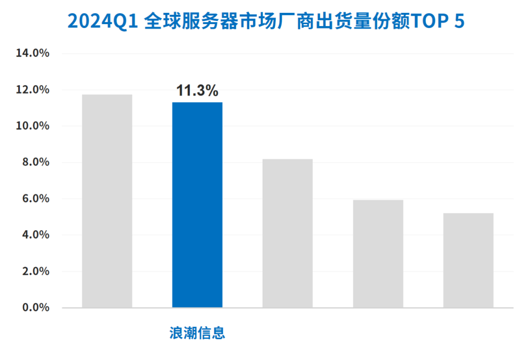 浪潮信息蝉联全球前二,中国第一,服务器出货量全球市场占比11.3%,同比增长50.4%,TOP5厂商增速第一。