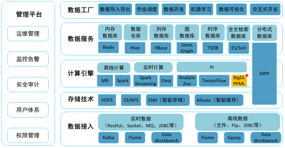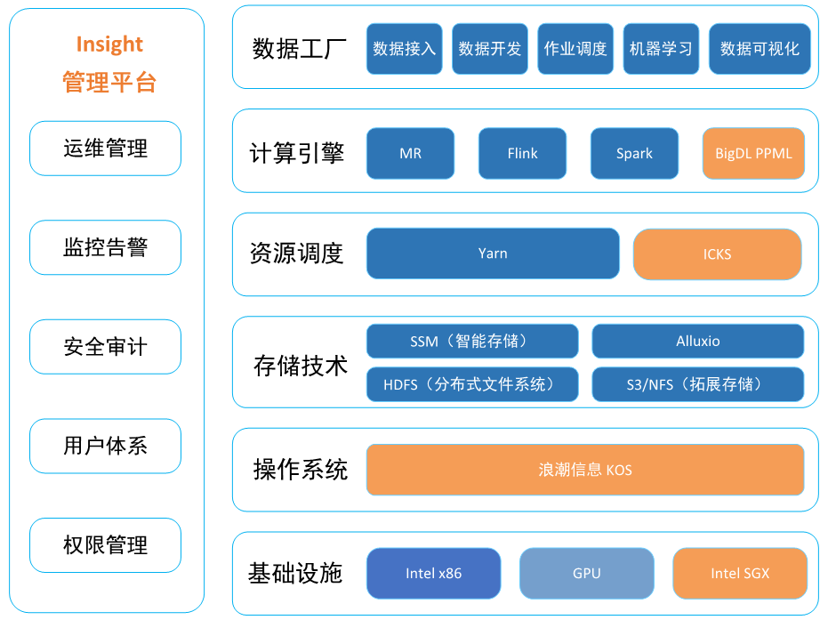 云海 Insight 是浪潮信息企业级大数据基础软件,集合业界主流的新型大数据处理技术,包含数据采集、数据存储、数据计算、检索服务、编排、数据湖、数据安全等30多个大数据组件,提供统一的平台化管理运维,实现深度功能增强和性能优化。BigDL PPML 作为 AI 计算的重要组成部分集成到 Insight 大数据平台中,提供 Spark SQL、ML/DL、联邦学习等功能,提升 Insight 平台 AI 服务能力。
