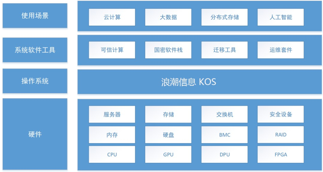 浪潮信息KOS是一款基于Linux Kernel、OpenAnolis等开源技术自主研发的服务器操作系统,支持x86、ARM等主流架构处理器,性能和稳定性属于行业领先地位。可满足云计算、大数据、分布式存储、人工智能、边缘计算等应用场景需求。