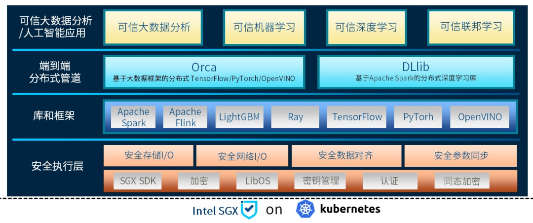 BigDL-PPML 是英特尔开源的大数据和人工智能应用平台BigDL构建的一个分布式的隐私保护机器学习平台,主要基于英特尔 SGX 可信执行环境技术。BigDL-PPML可以使公司企业在探索强大的人工智能技术的同时尽量降低处理大量敏感数据相关的安全风险。PPML可以有效保护存储、传输和使用中的数据:由SGX Enclaves保护的计算和内存、由加密保护的存储、由远程认证和传输层安全保护的网络通信,以及可选的联邦学习支持。