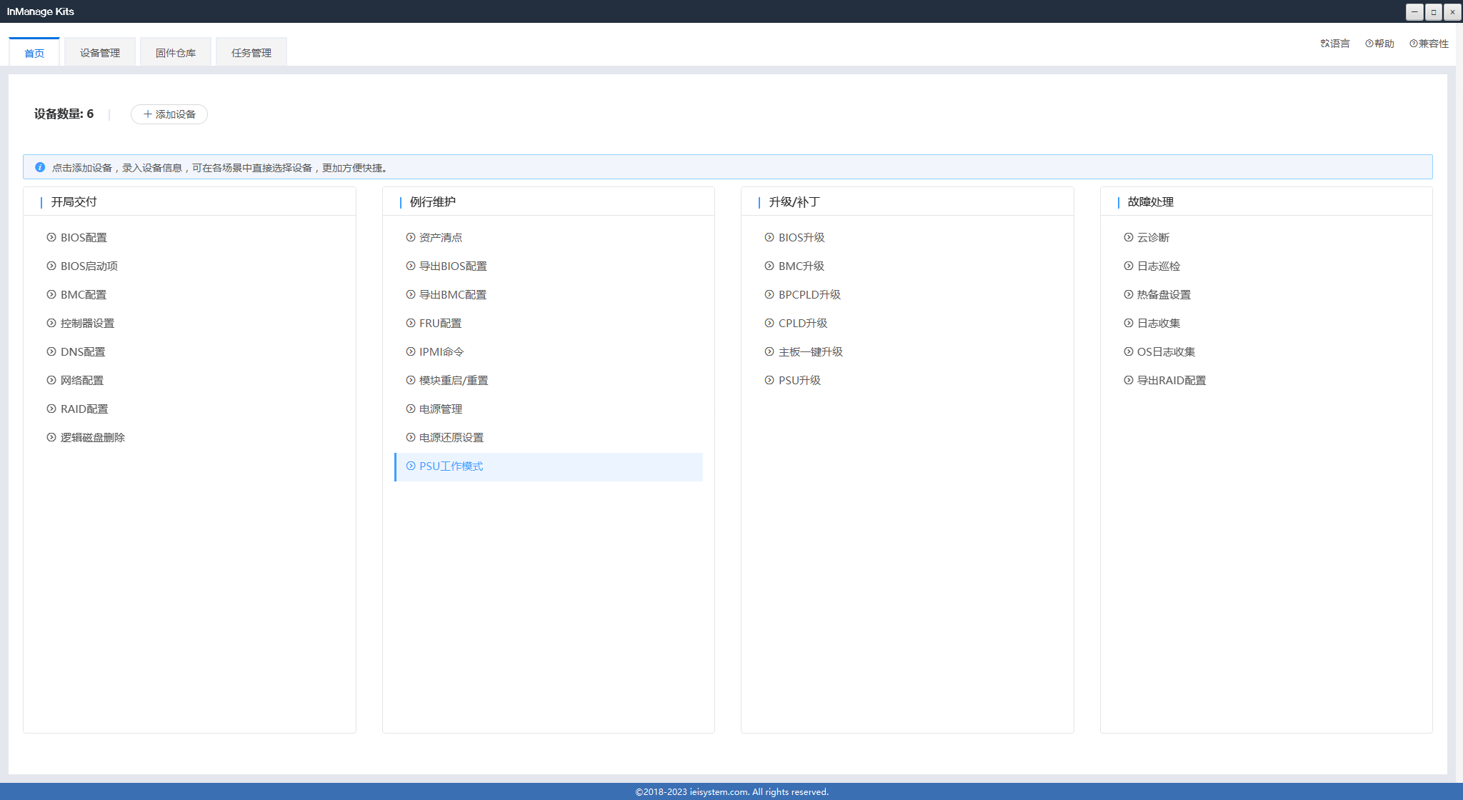 服务器自动化管理工具箱(InManage Kits),是一款轻量级的服务器自动化运维软件,主要应用于服务器的开局交付、例行维护、固件升级、故障处理等多个场景,提供高效的服务器自动化解决方案,可以有效提高数据中心运维效率。