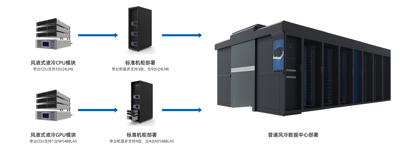方案由风液式液冷CPU模块(包含CDU和CPU算力液冷服务器)、风液式液冷GPU模块(包含CDU和GPU算力液冷服务器)和标准机柜部署组成,无需对现有机房进行任何改造,可实现在现有标准机柜内快速安装部署,且支持不同类型服务器在同一机柜中部署。方案适用于已有机房且无改造空间、或租赁机房的用户,可利用现有机房制冷条件,快速解决液冷服务器部署的难题。
