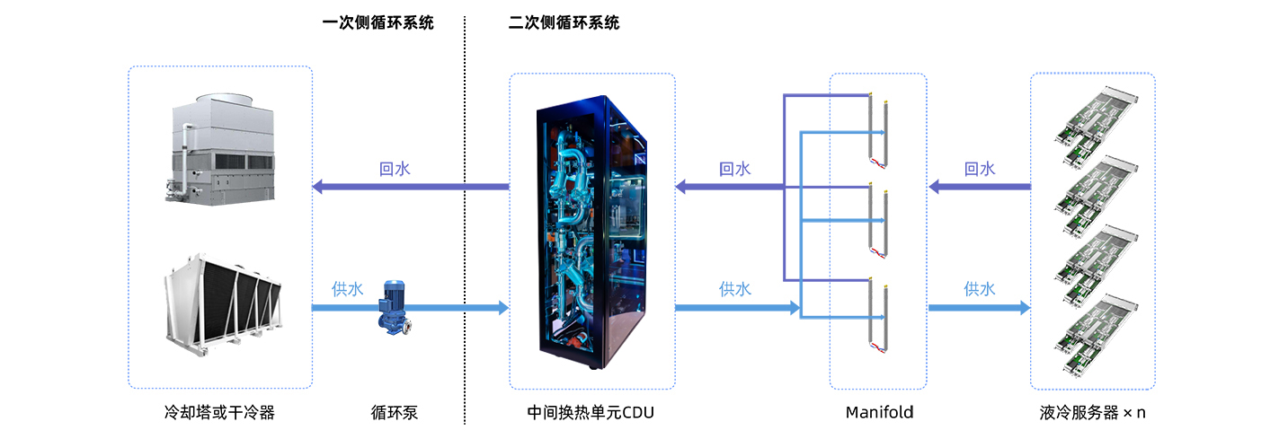 方案由冷却塔或干冷器、液冷散热系统(一次侧循环系统、二次侧循环系统)和液冷服务器组成。方案适用于有新建机房,并积极响应国家节能减碳政策需求的用户。