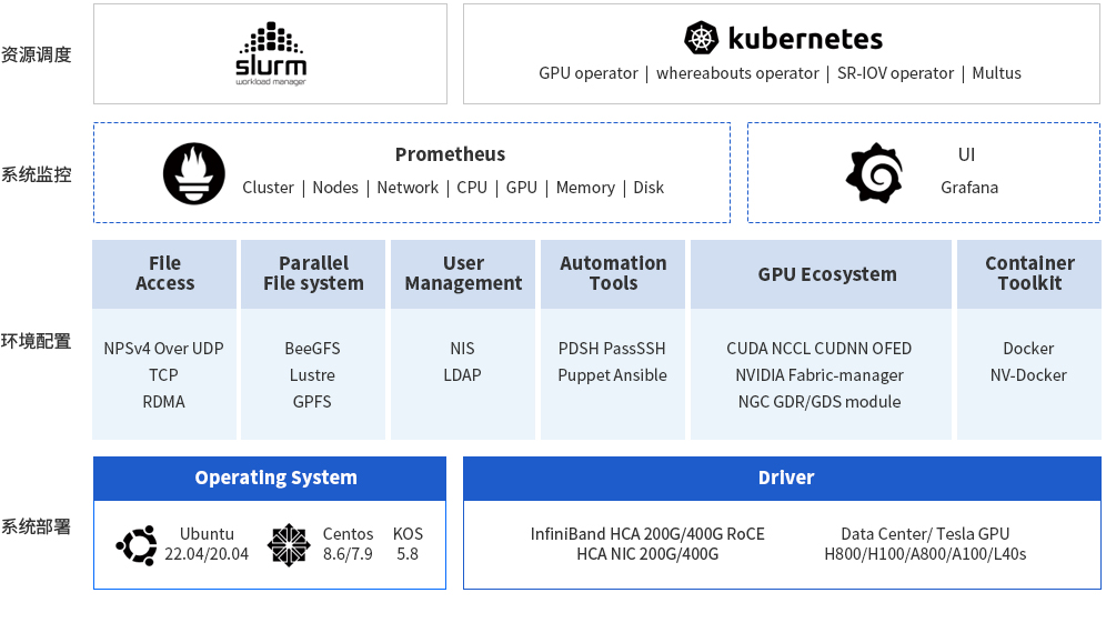 通过开源业界首个AI算力集群系统环境部署方案PODsys,结合AI算力集群优化经验,全面覆盖OS、驱动、系统监控可视化和资源调度等集群系统环境要素。
