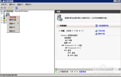 2、在服务器管理器中右击”功能”->”添加功能”打开添加功能向导窗口