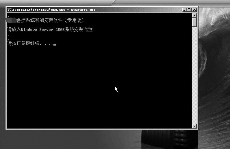 系统会自动弹出睿捷套件光盘,并提示放入windows 2003/2008安装光盘(上图为安装windows 2003的提示界面,该提示界面内容会因安装系统的版本而不同)。放入windows安装光盘后,按任意键,开始windows系统的自动安装过程。