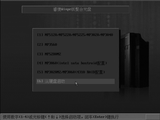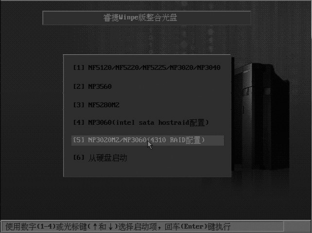 1)请您根据所购买的机型选择相应的选项,此例选择【np3020m2/np3060(4310 raid 配置)】选项,按回车键继续,如果系统提示“press any boot from CD…”,请按任意键继续,
