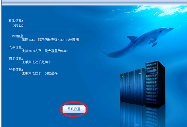 启动计算机,放入睿捷服务器套件光盘,在BIOS中设置从光盘引导计算机,在选择界面上,点击“睿捷系统智能安装软件”按钮,即可进入系统智能安装软件主界面。睿捷系统智能安装软件会根据探测到的硬件信息,自动显示机型信息。点击【系统设置】按钮,进入系统设置界面。