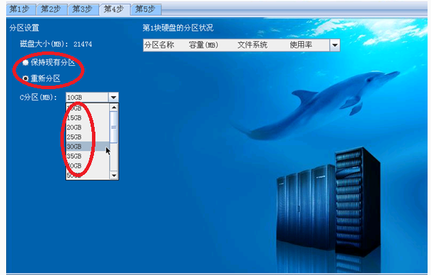 点击设置界面上的【第4步】按钮,用户可以对系统分区进行设置,其中有“保持现有分区”和“重新分区”两种方式,用户可任选其一。