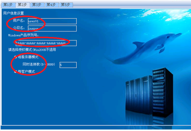 在设置界面【第1步】中,选择Windows 2003系列操作系统或者是Windows 2008系列操作系统,然后点击设置界面上的【第2步】按钮,即可进入设置界面【第2步】,用户可以对要安装的Windows操作系统进行用户信息设置、Windows产品序列号设置和授权模式设置。
