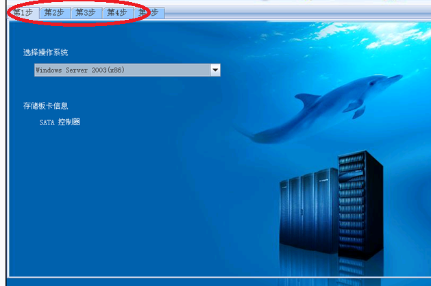 在主界面上,点击【系统设置】按钮,进入系统设置界面。在第1步界面中,可选择要安装的操作系统;睿捷软件将自动检测硬件设备,并显示检测到的存储板卡信息。选择完对应的操作系统“Windows Server 2008”后,点击“第2步”