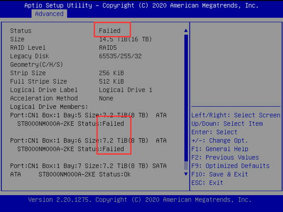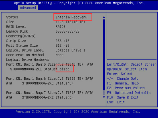 以Raid5为例,当阵列中有一块硬盘掉线时,阵列状态会变成Interim Recovery。硬盘状态会变成Failed,如下图所示。