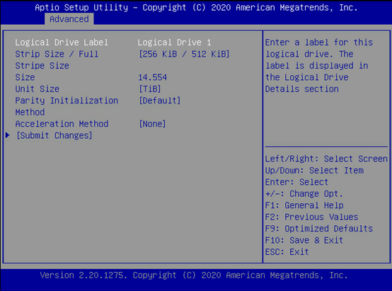 配置所需阵列信息,比如阵列名称、条带值大小等。设置完成以后点击Submit changes。