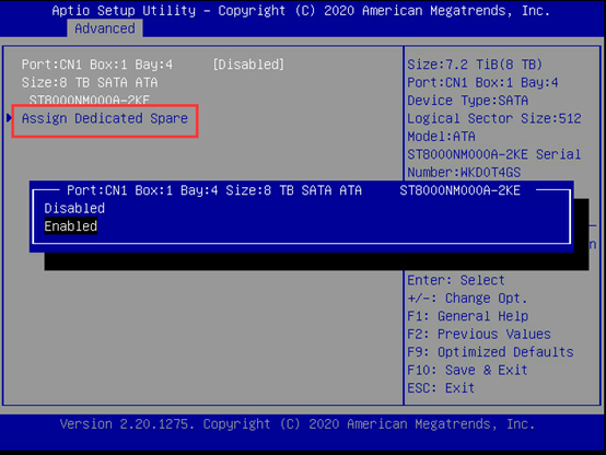 将要做热备的硬盘设置为Enabled模式,最后选择要做哪种形式的热备盘。