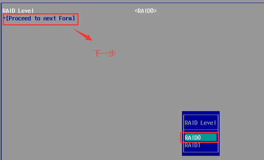 选择阵列级别,RAID0。继续点击Proceed to Form进入下一步。