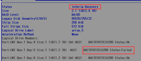 以Raid5为例,如果阵列中有一个硬盘掉线,那么阵列状态会变成Interim Recovery,硬盘状态变成Failed。