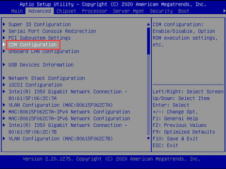 可以通过进入阵列卡配置界面查看,先进BIOS中【Advanced】—【CSM Configuration】。