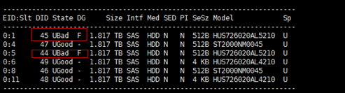 如图8-225所示,slot 1和slot 5硬盘的状态为”UBad F”,在OS下可通过以下步骤将硬盘状态恢复为”online”。