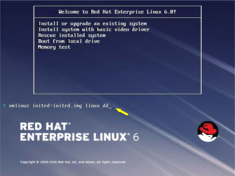 将光标移动至最后,输入linux dd回车开始安装。注意linux dd与前面的字符不要相连,要用空格隔开。