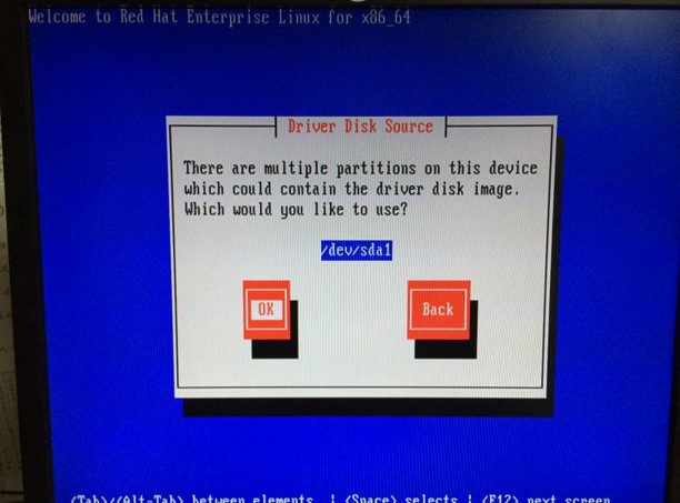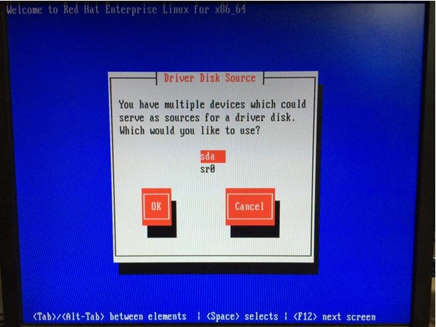 如下图,当前只识别到sda和sr0两个设备。sda是存放RAID卡驱动的U盘,sr0是光驱,没有本地磁盘,所以需要通过加载RAID卡驱动来识别本地磁盘。这里选择sda回车。
