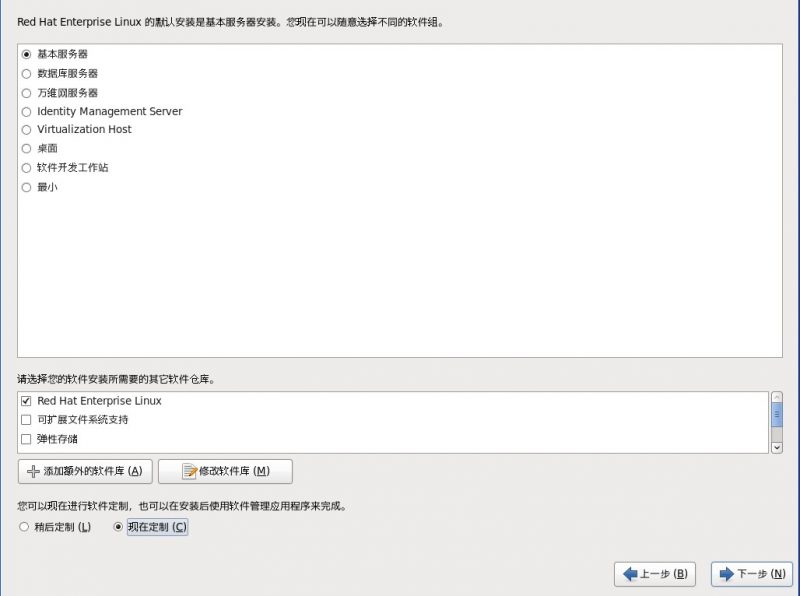 选择需要安装的软件包。默认选择基本服务器,注意勾选上“现在定制”选项,以便自定义需要安装的软件包。