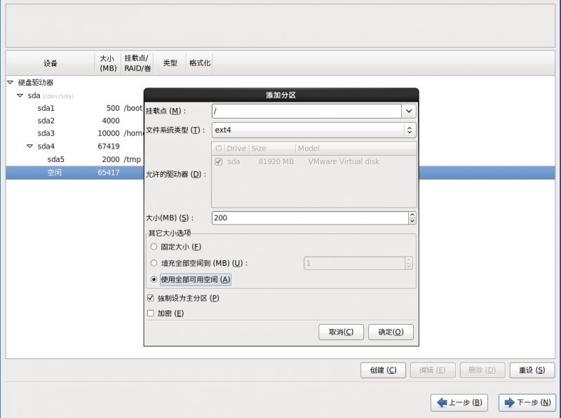 创建根分区/,如下图。挂载点选择/,文件系统类型选择ext4,大小可根据实际需要设置,或者使用全部可用空间。