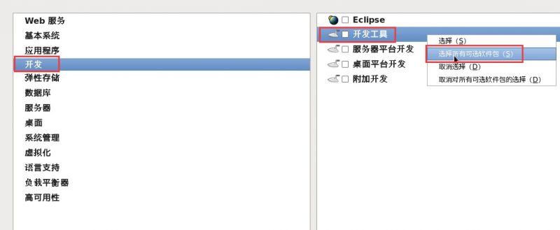 如果没有特殊要求,一般保持默认即可,但是一定要全选安装“开发工具”,即在“开发工具”上面右键,选择“选择所有可选的软件包”。如果不安装开发工具,系统装完后无法编译安装设备驱动,还有很多需要编译安装的软件也都无法正常安装。