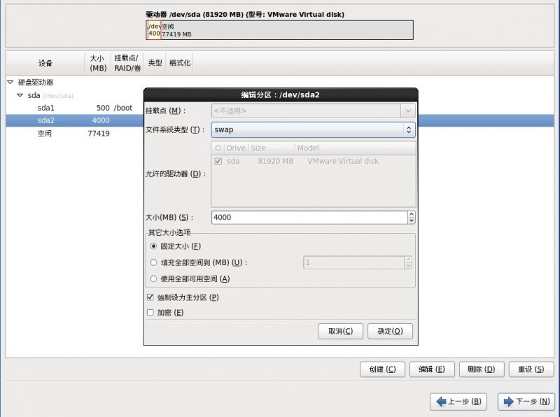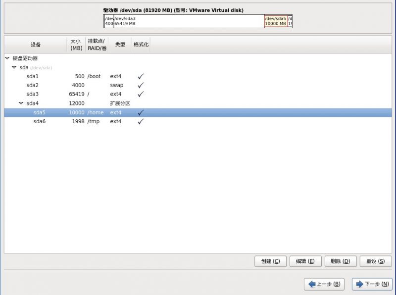 也可根据需要创建/home等分区,也可不创建。如下是已经创建好的磁盘分区举例,直接点击下一步。