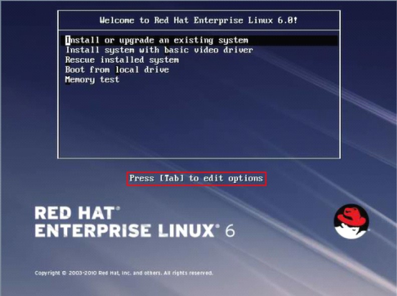 出现如下光盘引导界面,正常情况下直接回车即可安装。如果在安装系统过程中无法识别本地磁盘,需要在此处加载RAID卡驱动。此时请将包含RAID卡驱动文件的U盘插到服务器上,按一下TAB键,最下方会出现一行选项。