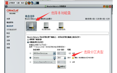 磁盘选择,选择安装使用的本地磁盘,以及分区类型。